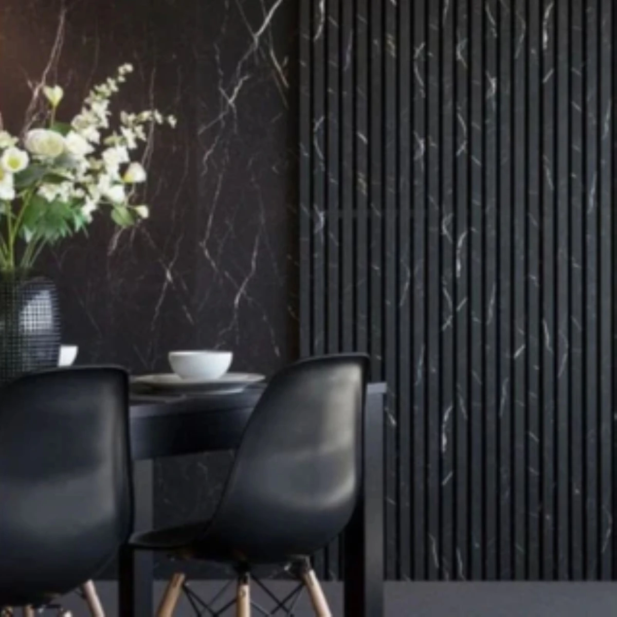 Die dekorativen, glänzenden Lamellen auf schwarzem Akustik-Filz verleihen des Akustikpaneeles MARBLE einen Hauch von Eleganz und Stil. Gleichzeitig sorgt es für eine angenehmere Akustik in jedem Raum.