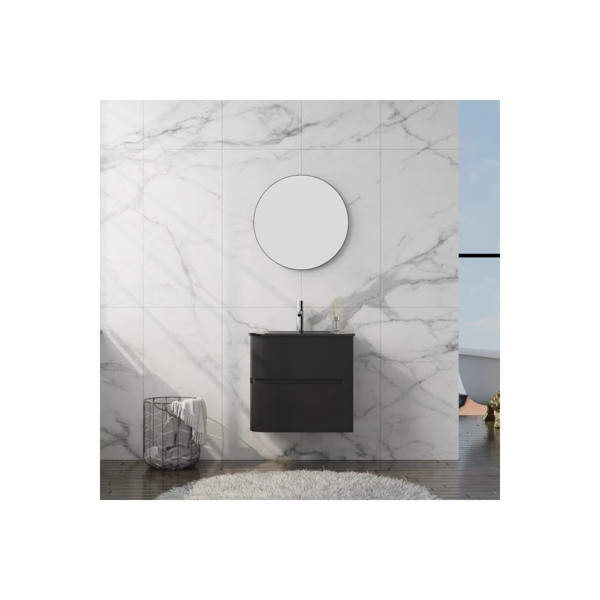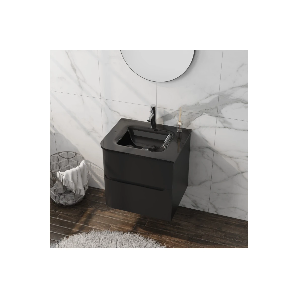 Der Waschtischunterschrank ATLANTA BLACK 600 zeichnet sich durch sein modernes Design aus. Das Highlight ist der Kontrast zwischen dem mattschwarzen Unterschrank und dem spiegelglatten Glaswaschbecken mit abgerundeten Innenkanten, das nahtlos in das Möbelstück integriert ist und einen herrlichen Akzent setzt.
