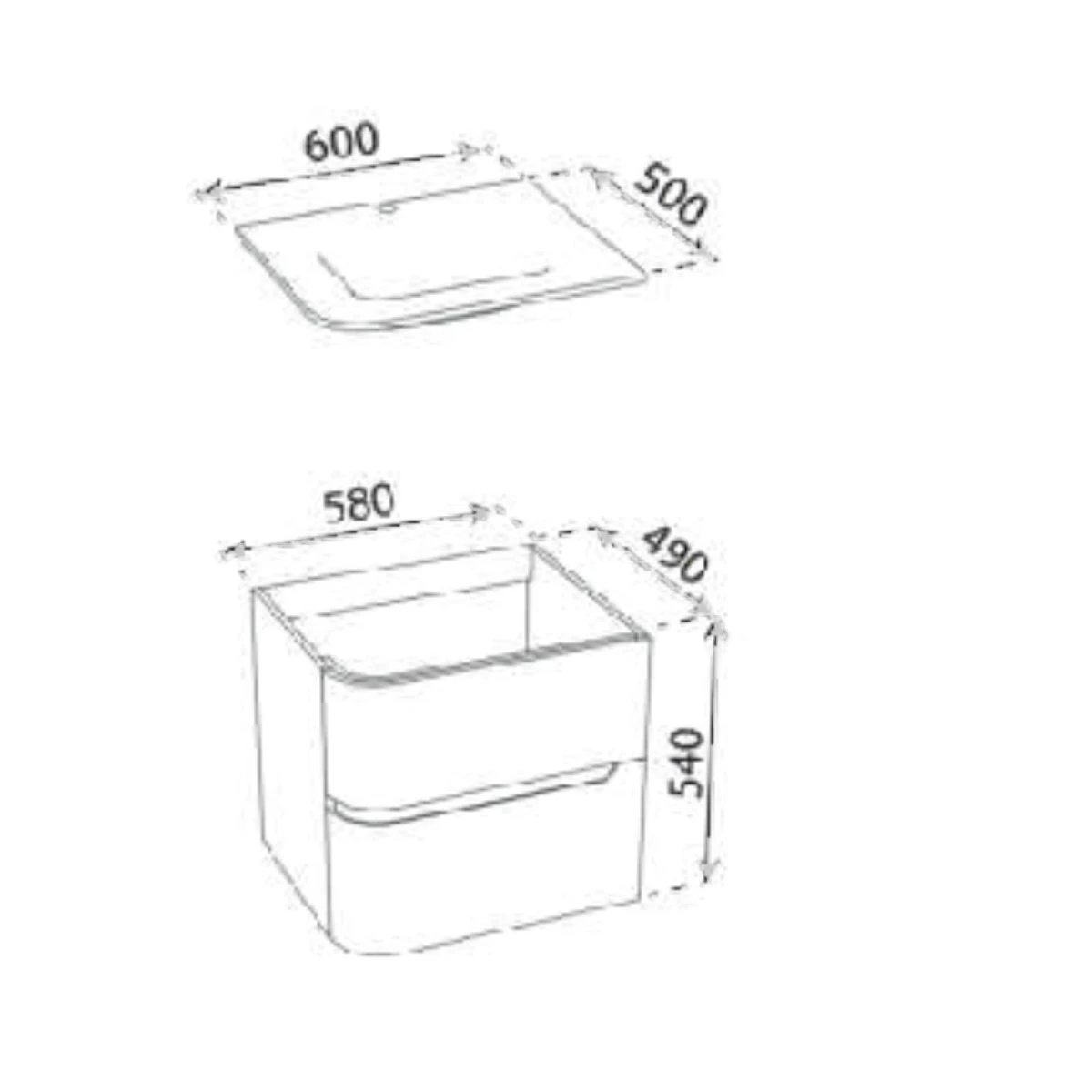 Abmessungen (L×B×H): 580 × 490 × 540 mm (Waschtischunterschrank); 600 × 500 mm (Einbauwaschtisch)