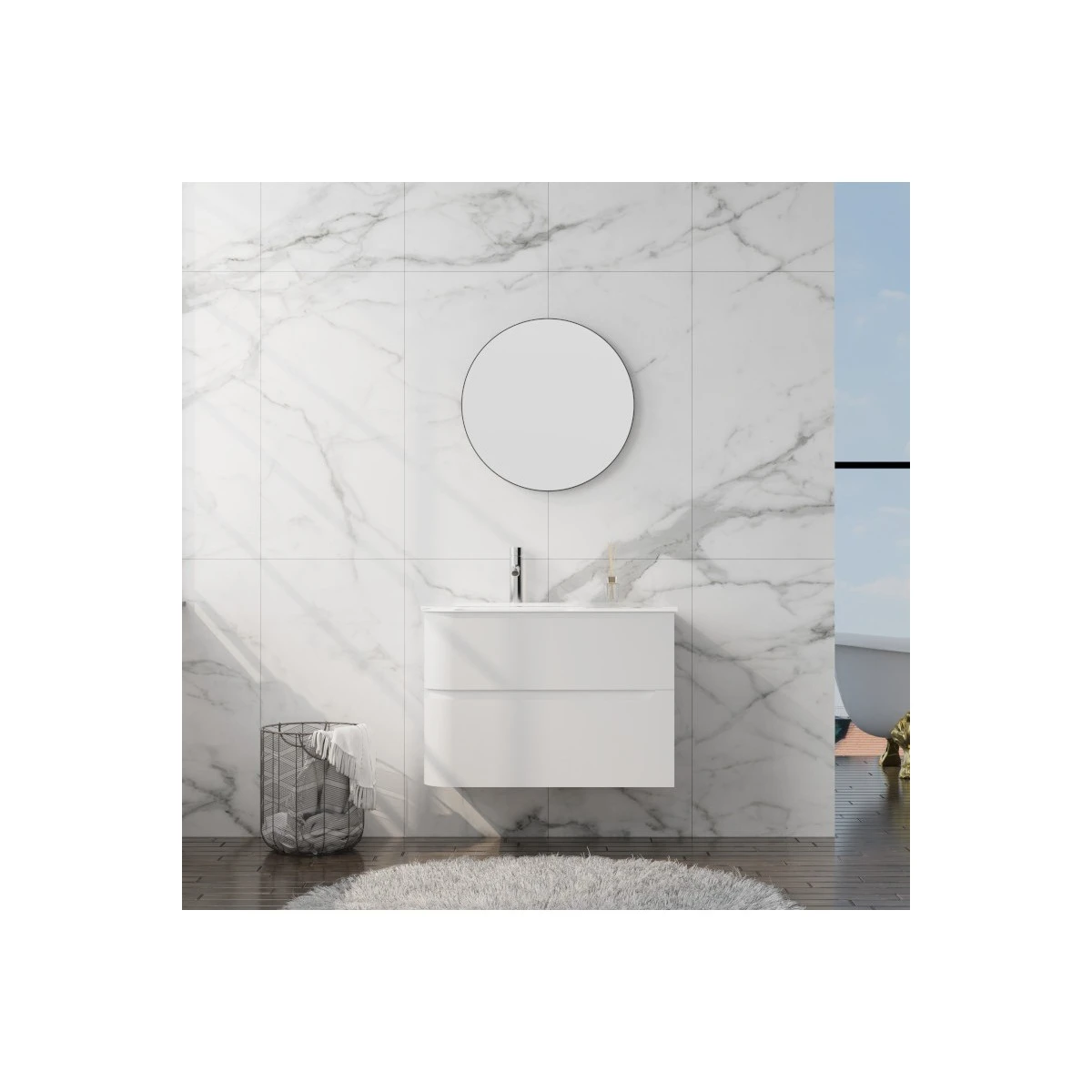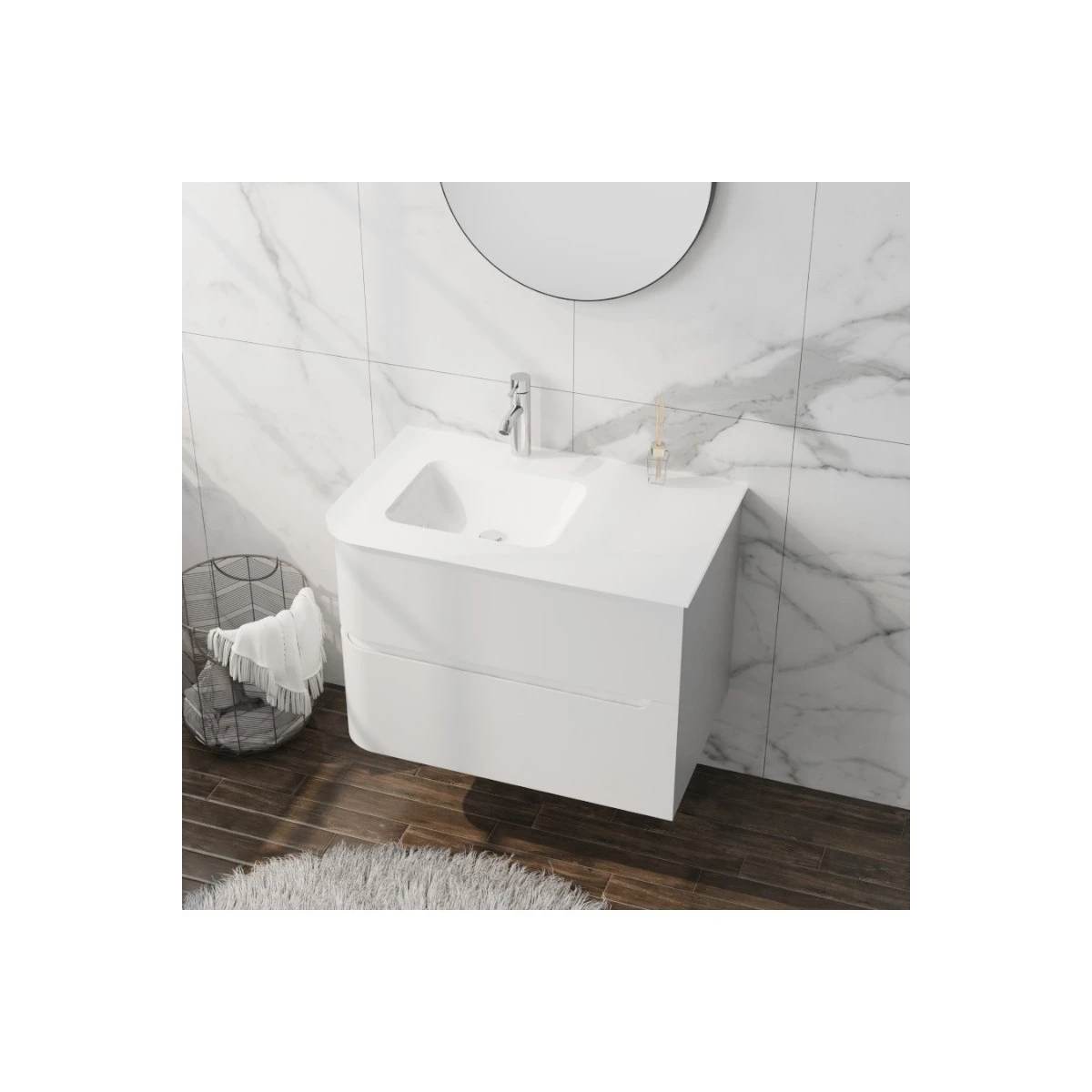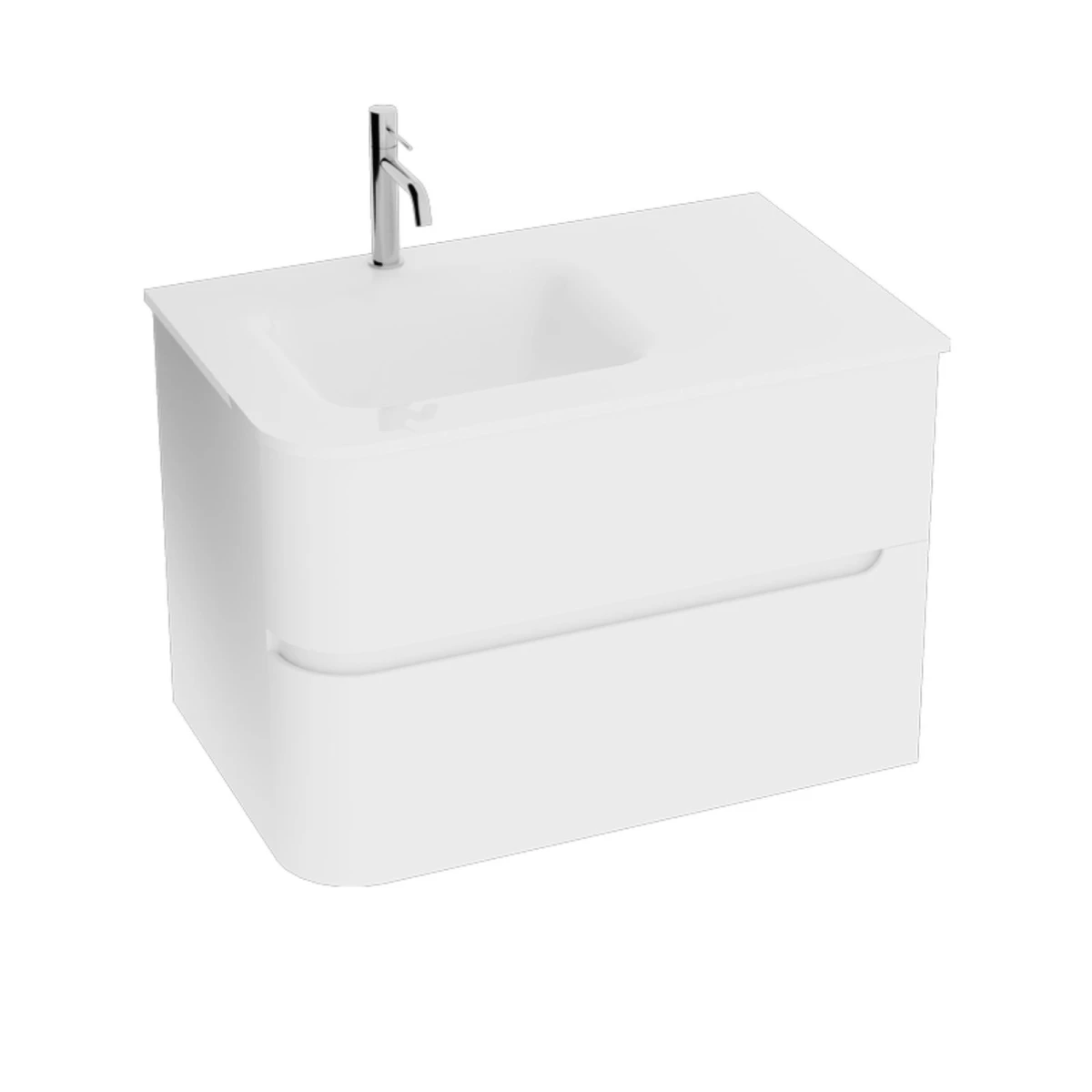 Die dezent integrierten Griffe und eine elegant abgerundete Ecke des Schrankes unterstreichen die glatte Front sowie klare Linienführung und machen diese Waschtischkombi zur idealen Wahl für jedes Badezimmer.
