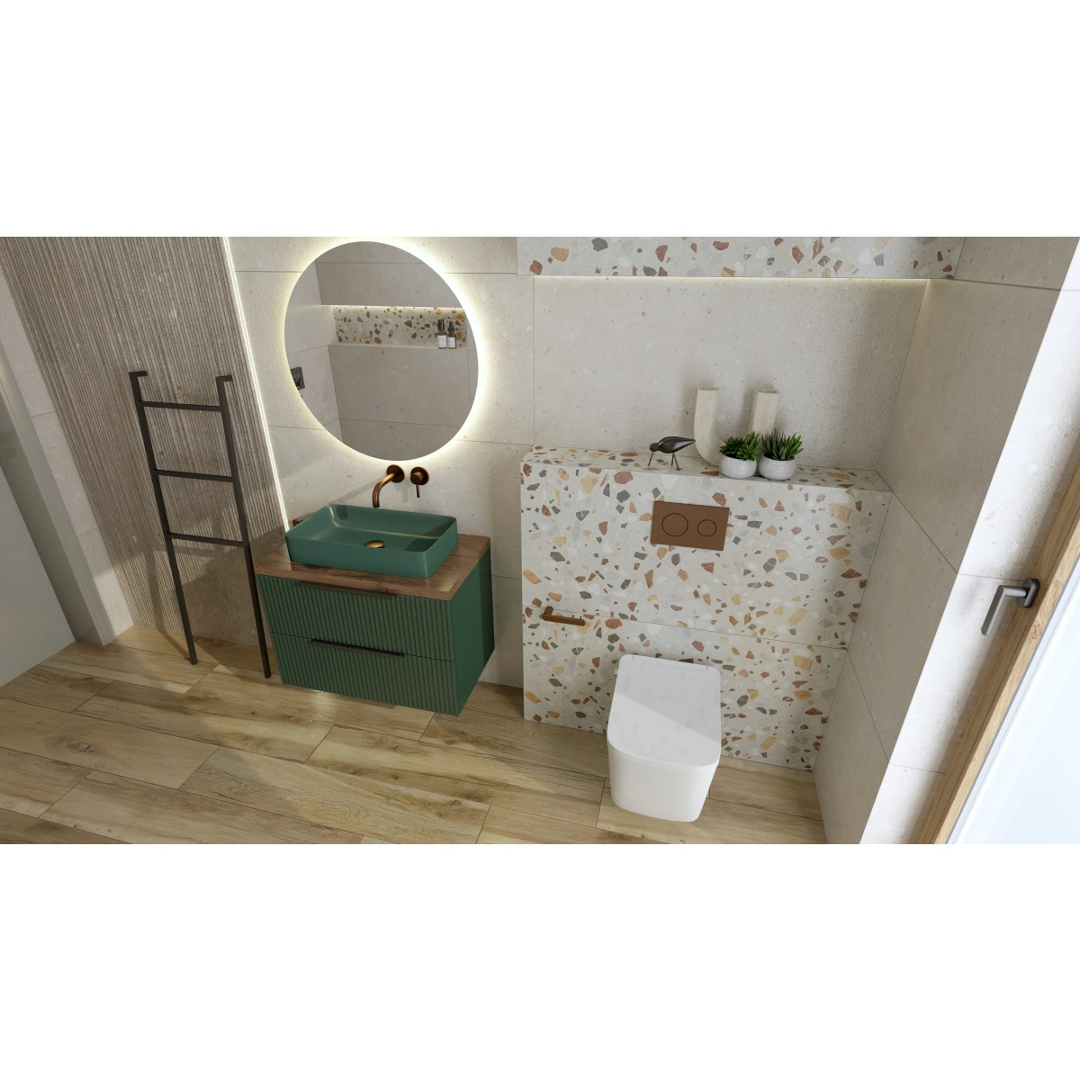 Das rechteckige Aufsatzwaschbecken PASANA GREEN besticht durch seine hochwertige Keramik und luxuriöse Optik.