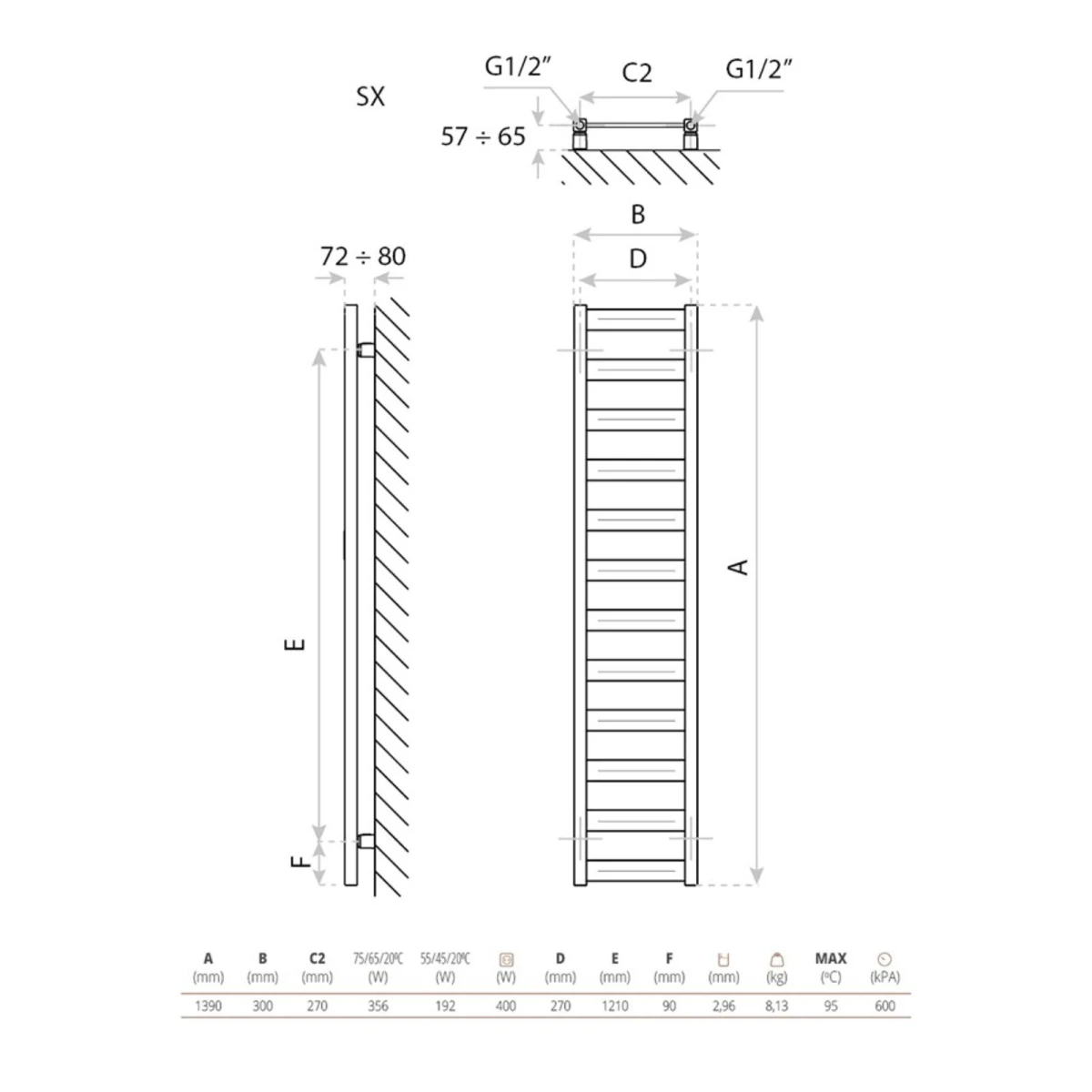 Badheizkörper HERMES BLACK 1390 für Mischbetrieb, Anschluss beidseitig, unten (300×1390 mm), matt, schwarz
