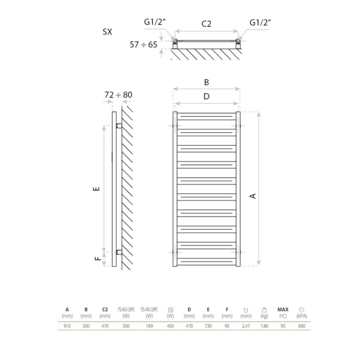 Abmessungen (L×H): 500 × 910 mm