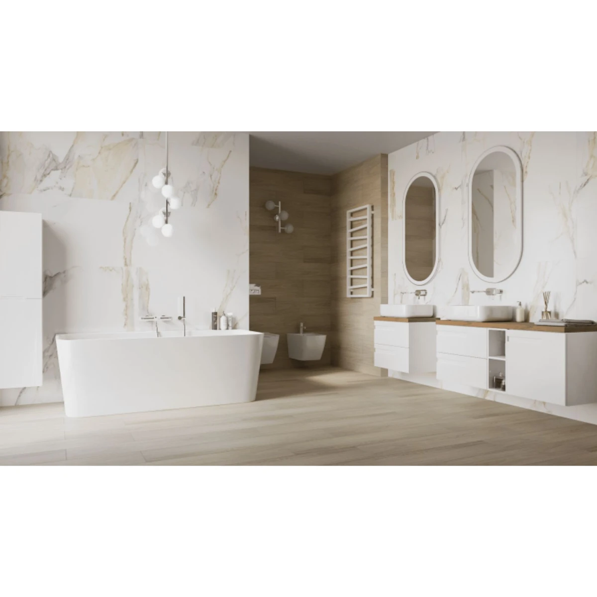 Dieser stilvolle Spiegel KALISTO mit ebenmäßigen LED-Hintergrundbeleuchtung wirkt, dank der abgerundeten Form, sehr elegant. Das Licht lässt sich ganz einfach mit einem Wandschalter betätigen und sorgt in jedem Badezimmer für eine angenehme Atmosphäre.
