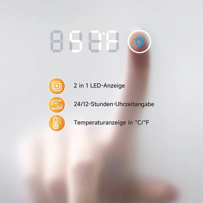 - 2-in-1 Touchschalter: Zum Einstellen der LED-Beleuchtung, mit Uhr- und Temperaturanzeige. Durch langes Berühren können Uhrzeit und Temperatur eingestellt werden.