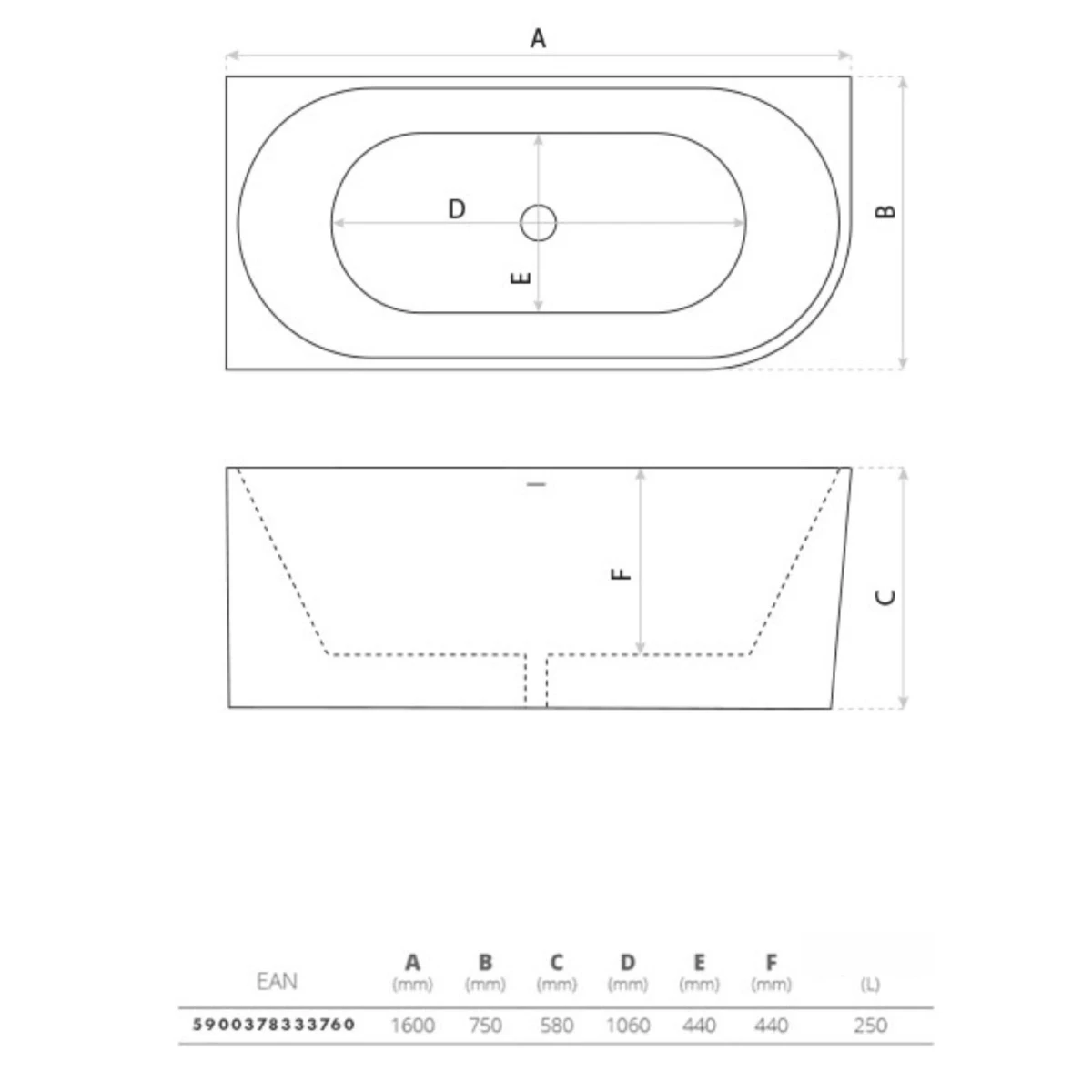 Eck-Badewanne CALDERA 1600 R, Einbau rechts, ovale Innenform (1600×750×580 mm), 250 Liter, glänzend, weiß