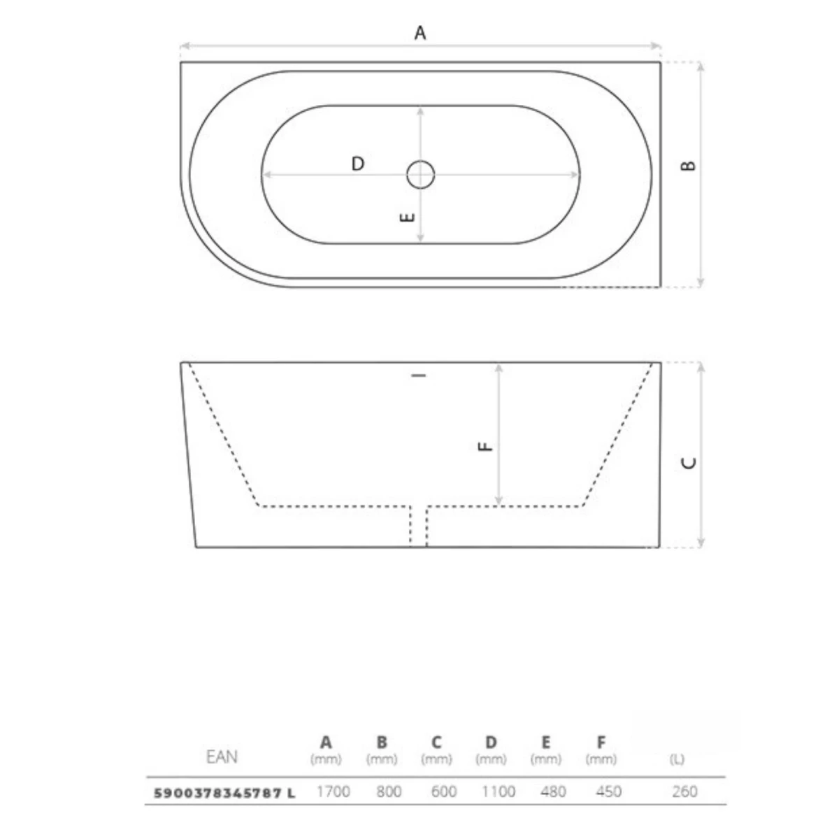 Eck-Badewanne CALDERA 1700 L, Einbau links, ovale Innenform (1700×800×600 mm), 260 Liter, glänzend, weiß