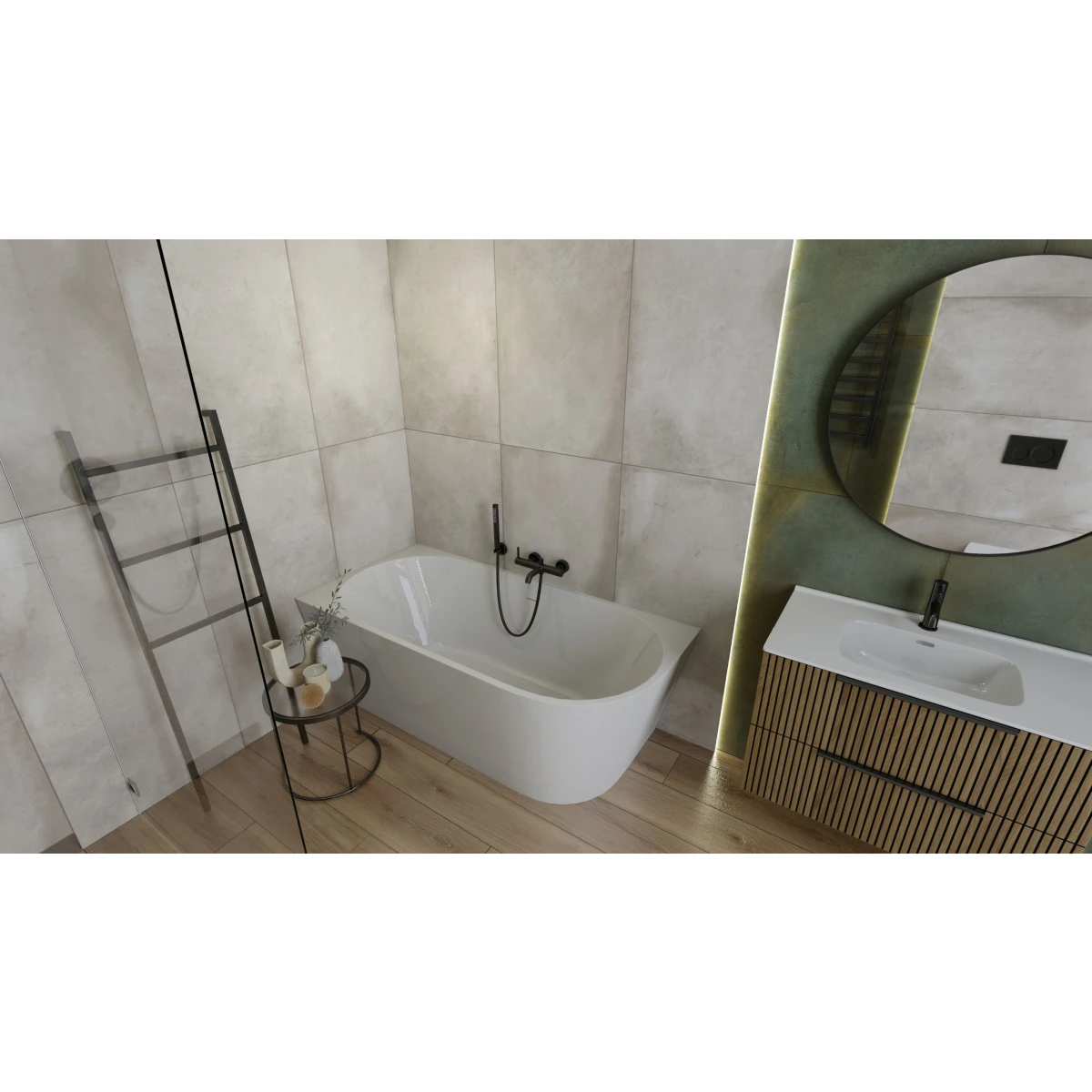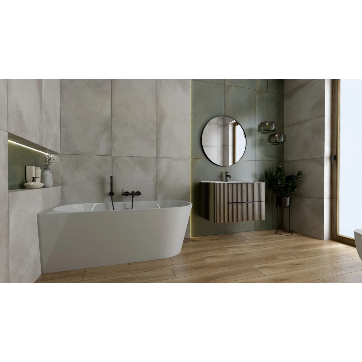 Die Raumsparbadewanne CALDERA 1700 R mit eleganter ovaler Innenform wird komplett mit einem stabilen Rahmen und höhenverstellbaren Füßen geliefert. Sie lässt sich direkt auf dem Boden montieren und ist die perfekte Wahl für platzsparende Badlösungen. Die Oberfläche aus Sanitäracryl besitzt ein seidig glänzendes Finish und lässt sich einfach reinigen. Zusätzlich sorgt eine integrierte Ablagefläche für praktischen Stauraum für Pflegeprodukte.