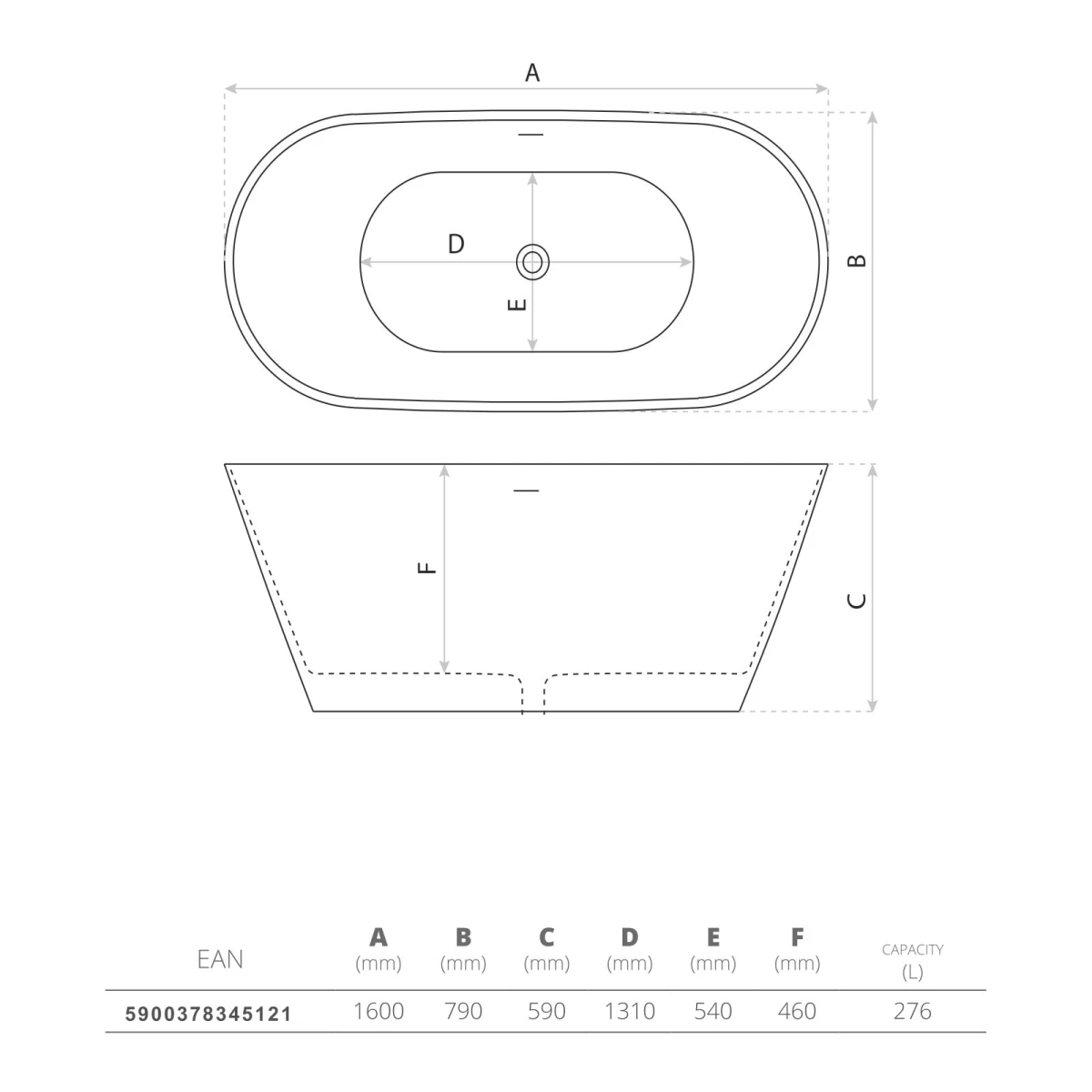 Freistehende Badewanne MIJAS, oval (1600×790×590 mm), 276 Liter, glänzend, weiß