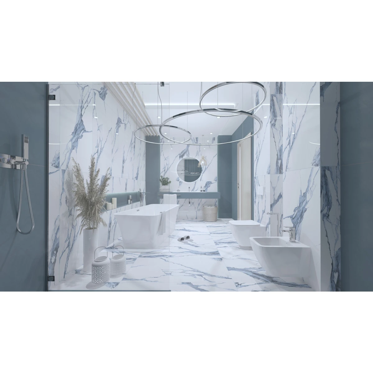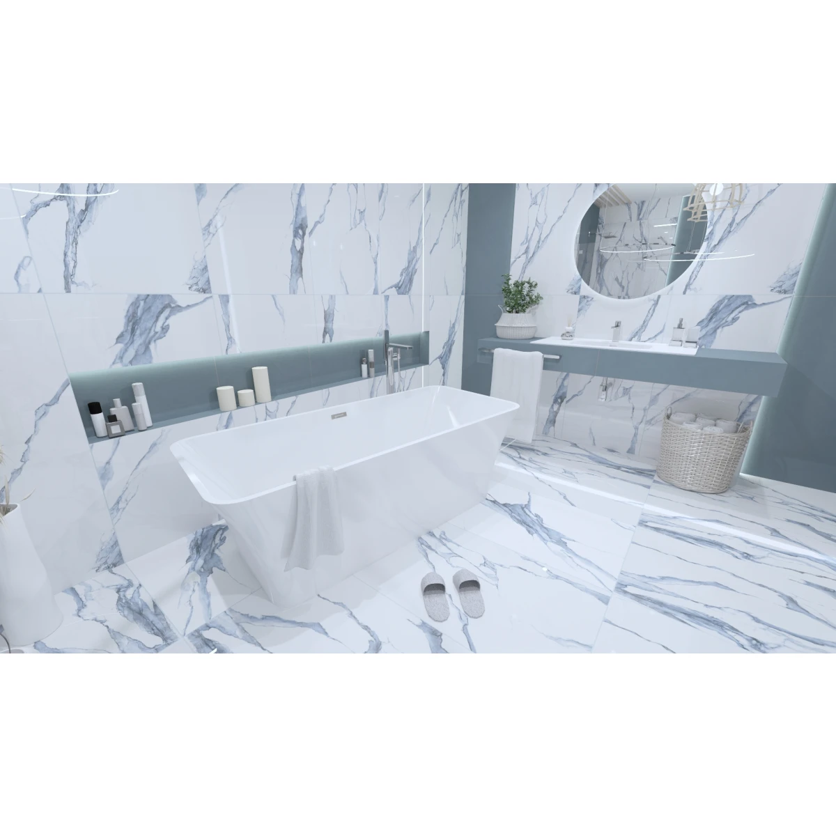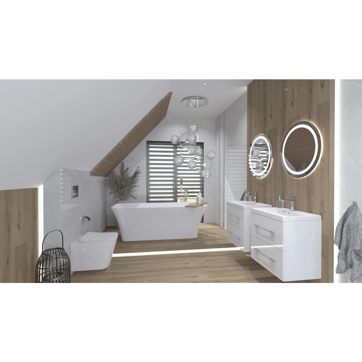 Ins Auge fallende Badewanne RILASSA beeindruckt durch ihre markante Formsprache. Die nach unten hin leicht geschwungene Form und die abgerundeten Ecken sorgen dafür, dass mehr Bodenfläche sichtbar bleibt, was den Raum größer und offener wirken lässt.