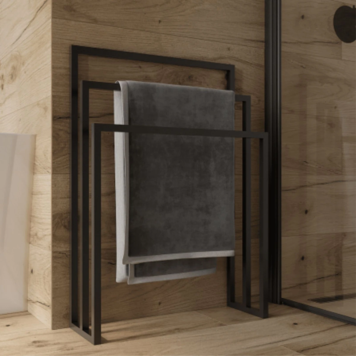 Der freistehende Handtuchständer SERAM aus schwarzem Metall besticht durch sein elegantes Design und bietet viele gestalterische Möglichkeiten. Dank abgestufter Ebenen ermöglicht er eine optimale Luftzirkulation, was die Trocknung der Handtücher beschleunigt.