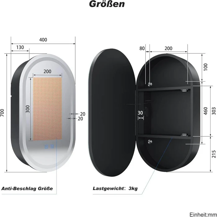 - Konstruktion und Design: Ovaler Spiegelschrank im modernen Stil, Größe: 40 × 70 × 14 cm. Hochwertiges, rostfreies Metall mit mattschwarzer Oberfläche für einen einzigartigen Look.